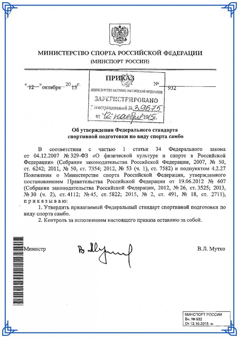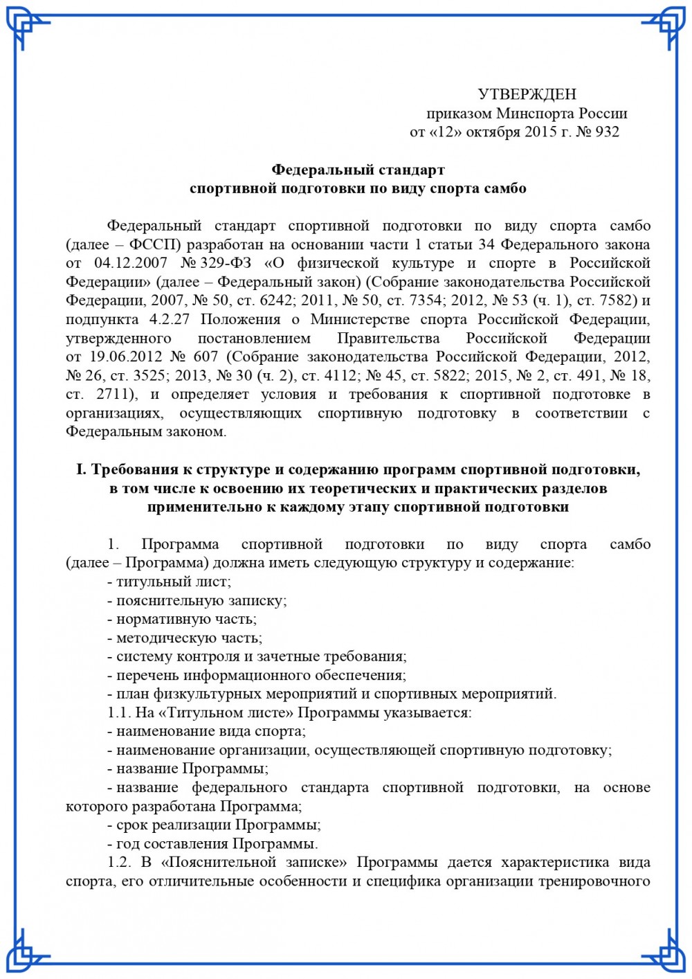 ФССП по виду спорта "САМБО". Минспорт России, приказ №932 от 12.10.2015 г.